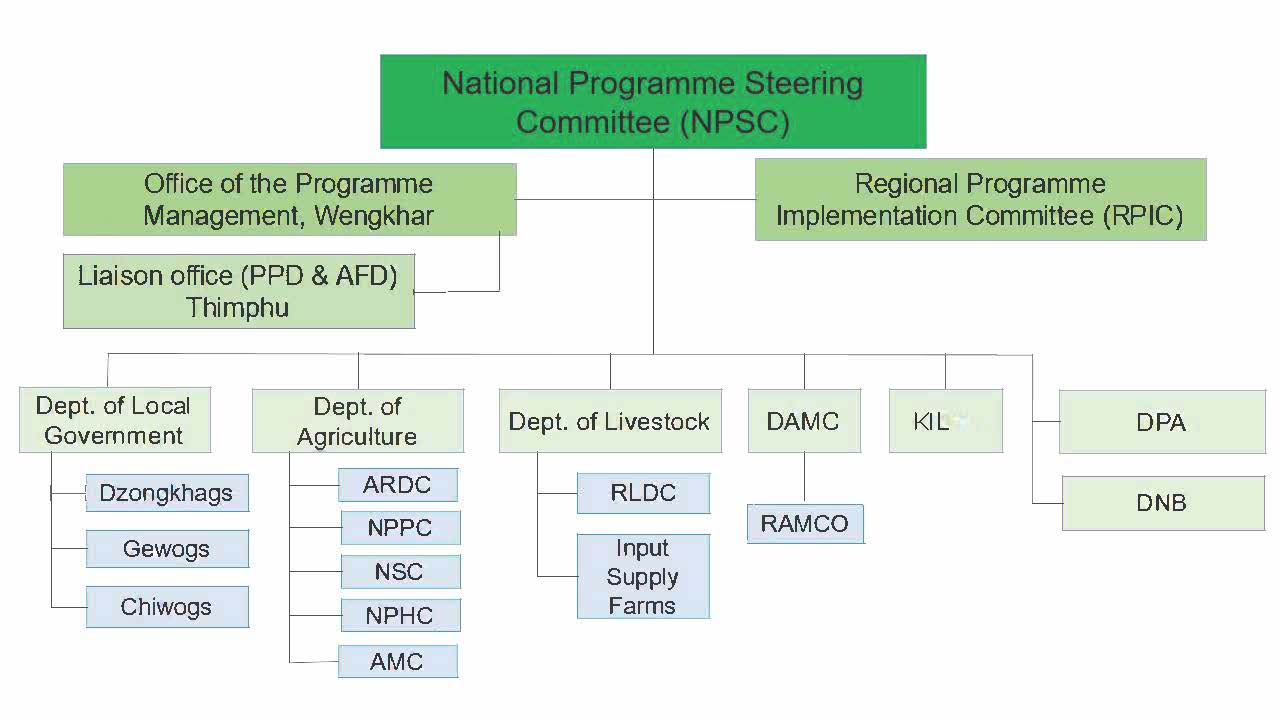 The Office of the Programme Management will lead the overall implementation of the project lead by the National Project Director who will mainly facilitate linkages and coordination in line with the AWPB, National Program Steering Committee (NPSC) and a Regional Project Implementation committee (RPIC) to ensure the project is in line with the project design, MoAF policies, strategies and funding requirements. Its actual implementation through components will be lead by the respective CMs with assistance of the Regional Agencies through appointment of key focal persons to provide technical assistance and at the Dzongkhags and Gewogs, respective Dzongkhag Agriculture Officers and Dzongkhag Livestock officer with their Gewog extension officers will lead implementation in the field. The CMs and the focal persons from the regional production and marketing agencies will maintain consistent interaction with the Dzongkhag and Gewog Extension officers for agriculture and livestock and assist them in the implementation.