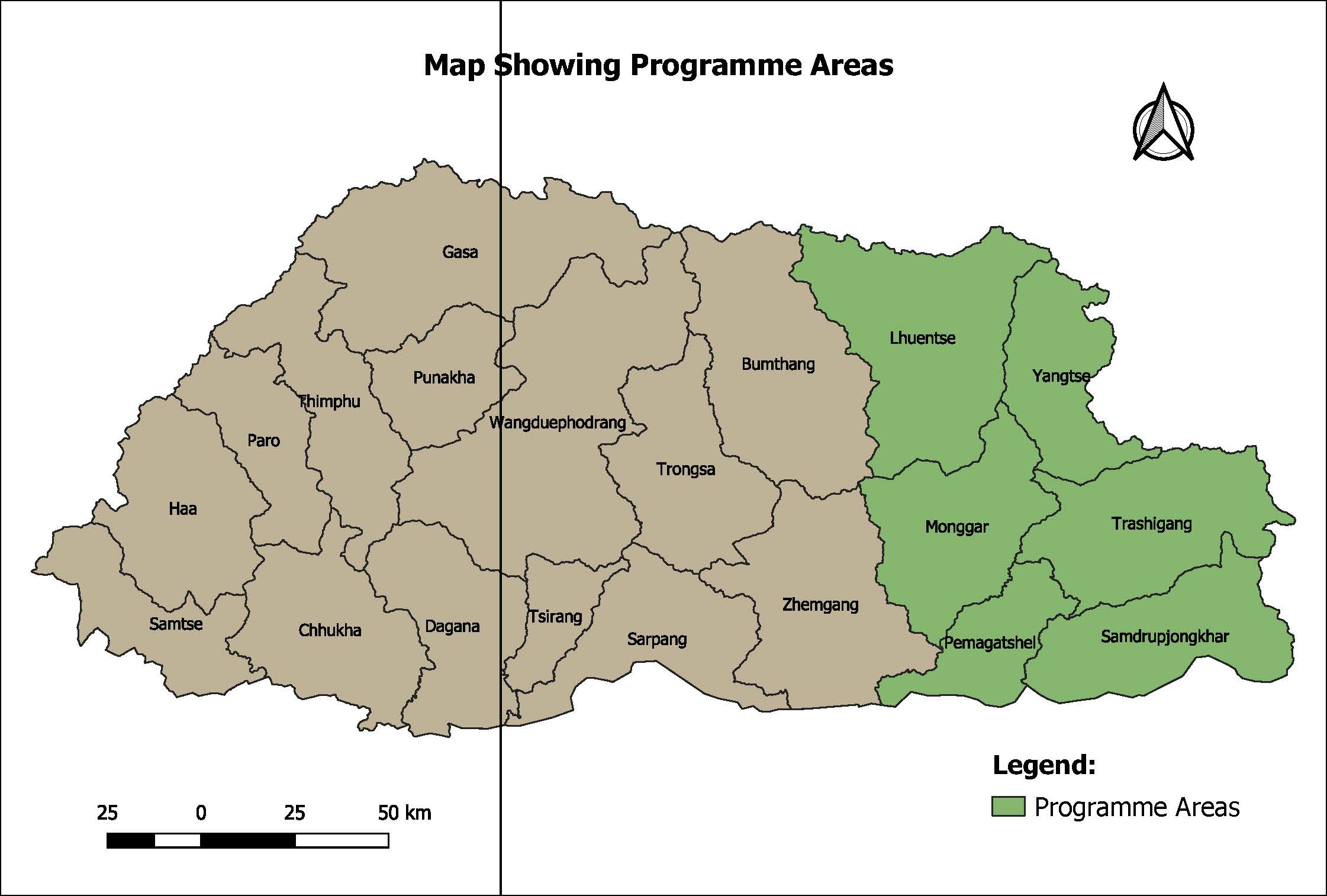 The programme shall work with approximately 28,975 households in 6 eastern Dzongkhags (Lhuentse, Mongar, Pemagatshel, Samdrup Jongkhar, Trashi Yangtse, and Trashigang) to expand the Programme’s impacts by targeting entire villages and then clustering communities by commodities produced. This will ensure inclusion, greater adoption and enhance knowledge, enable production on a sufficient scale to attract buyers, increase access to markets and promote greater climate sustainability.