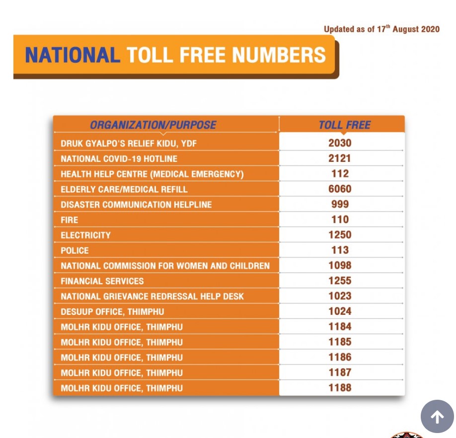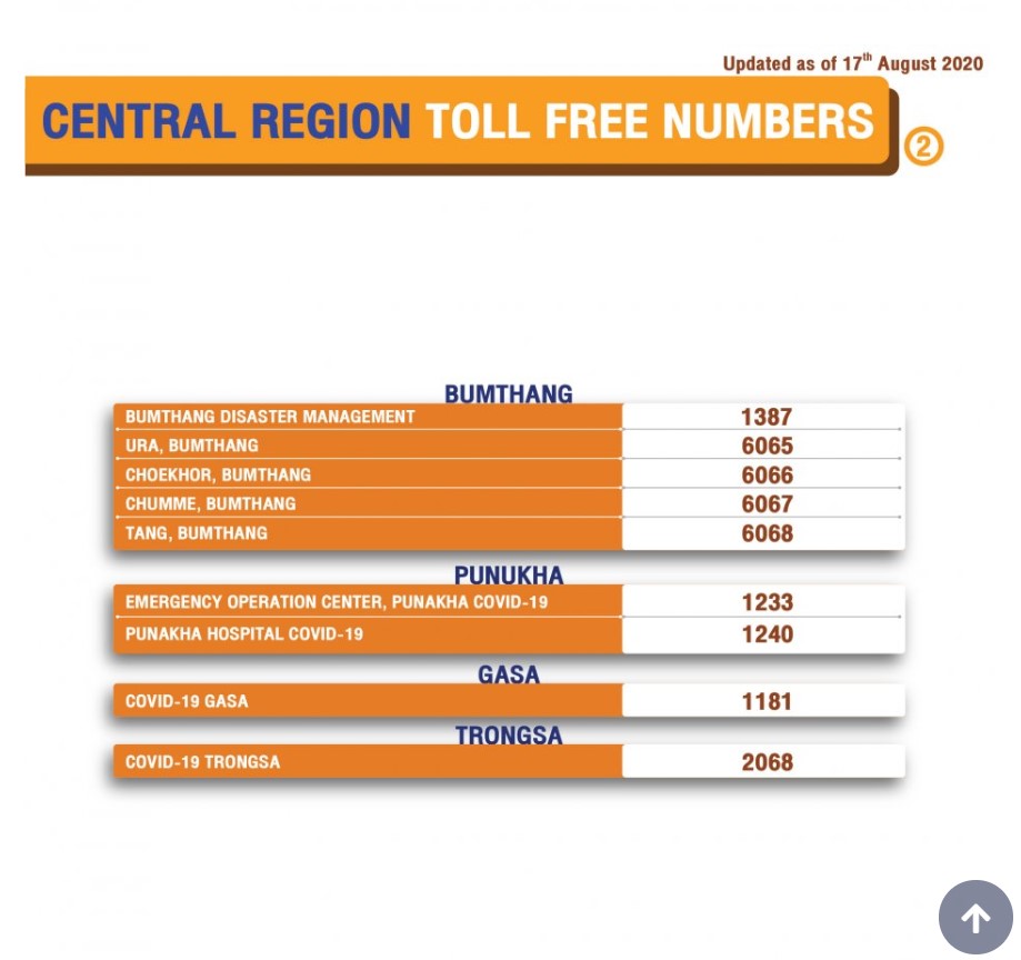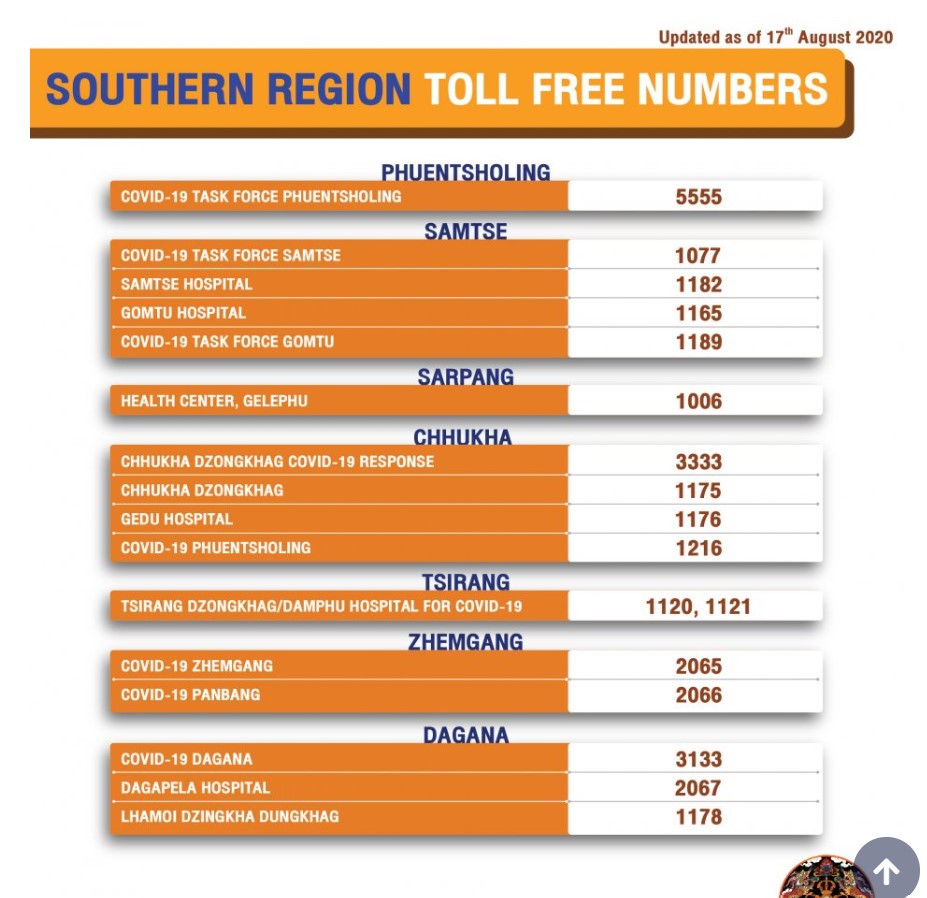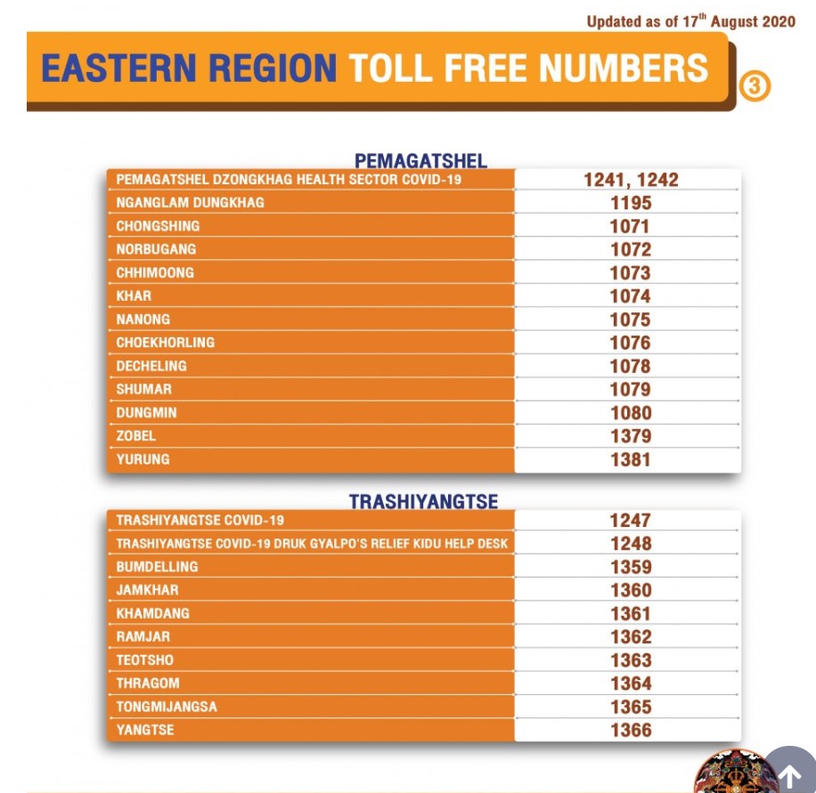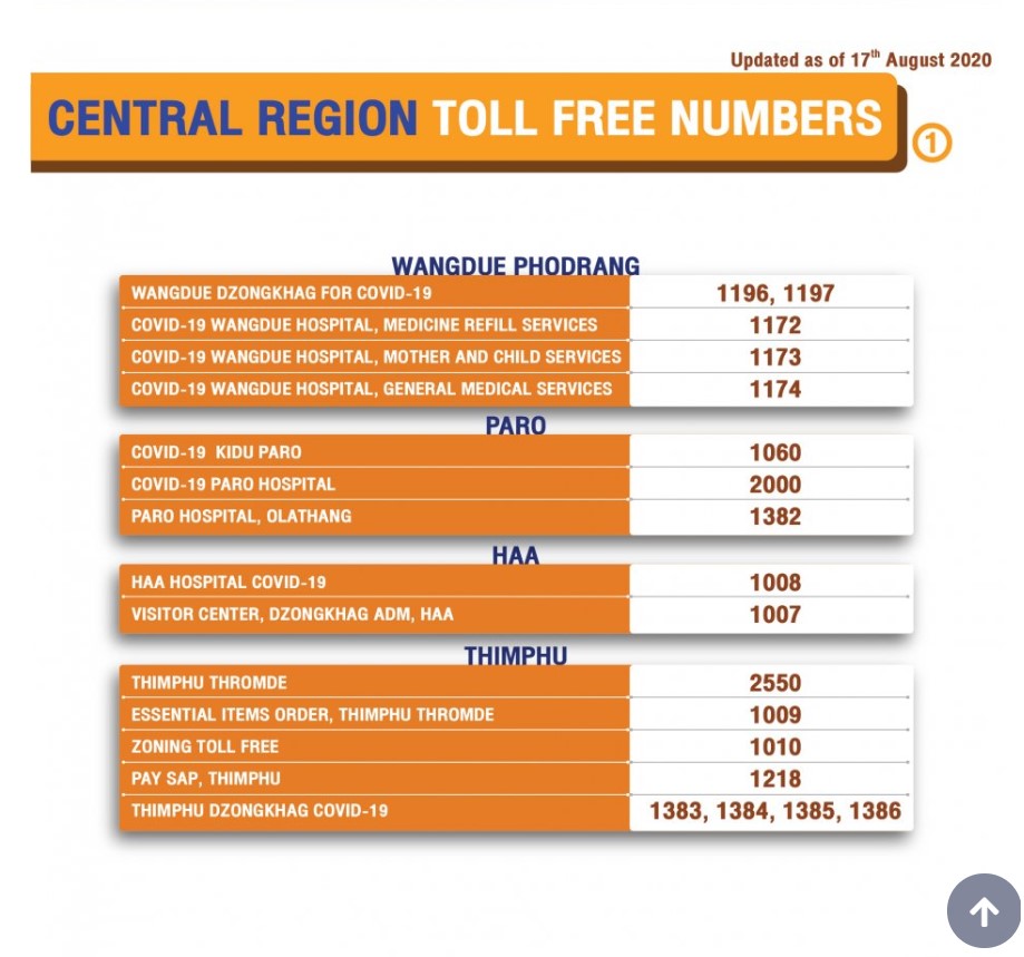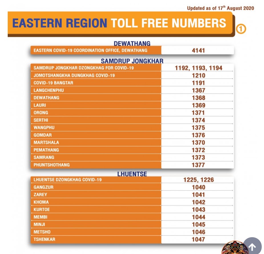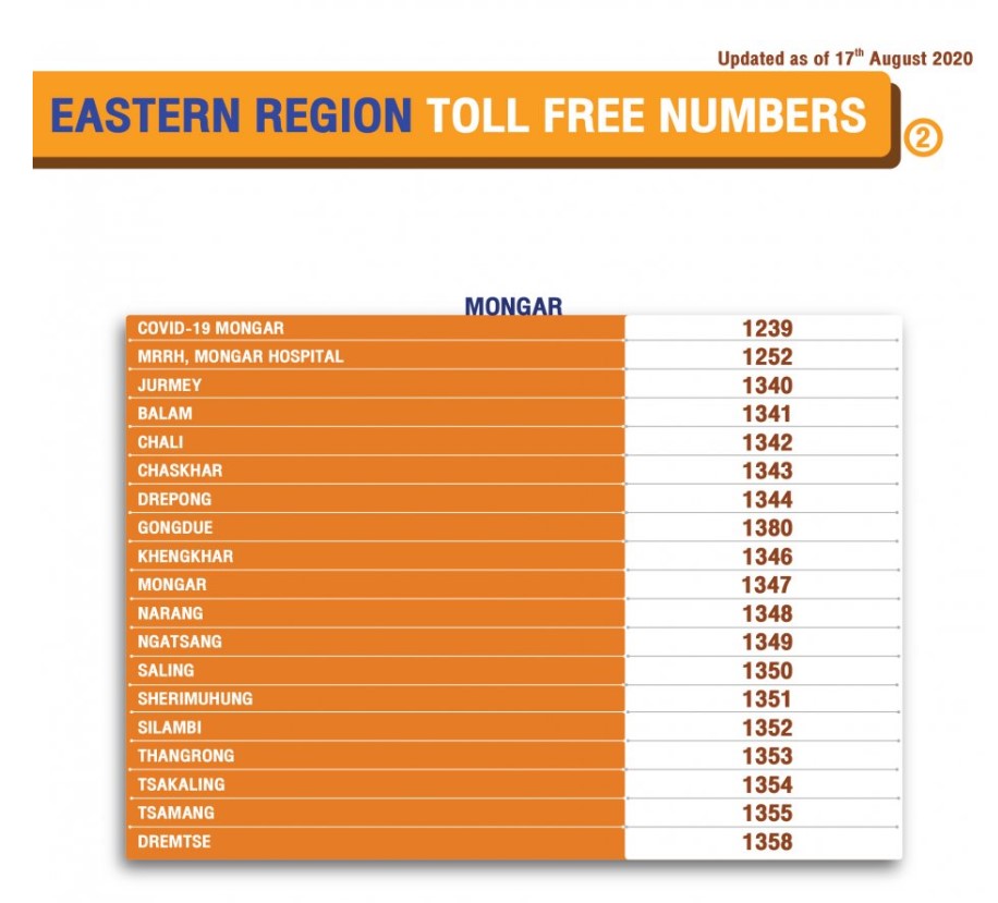 Toll Free Numbers – National, Central, Southern and Eastern Regions of Bhutan (17th Aug 2020)